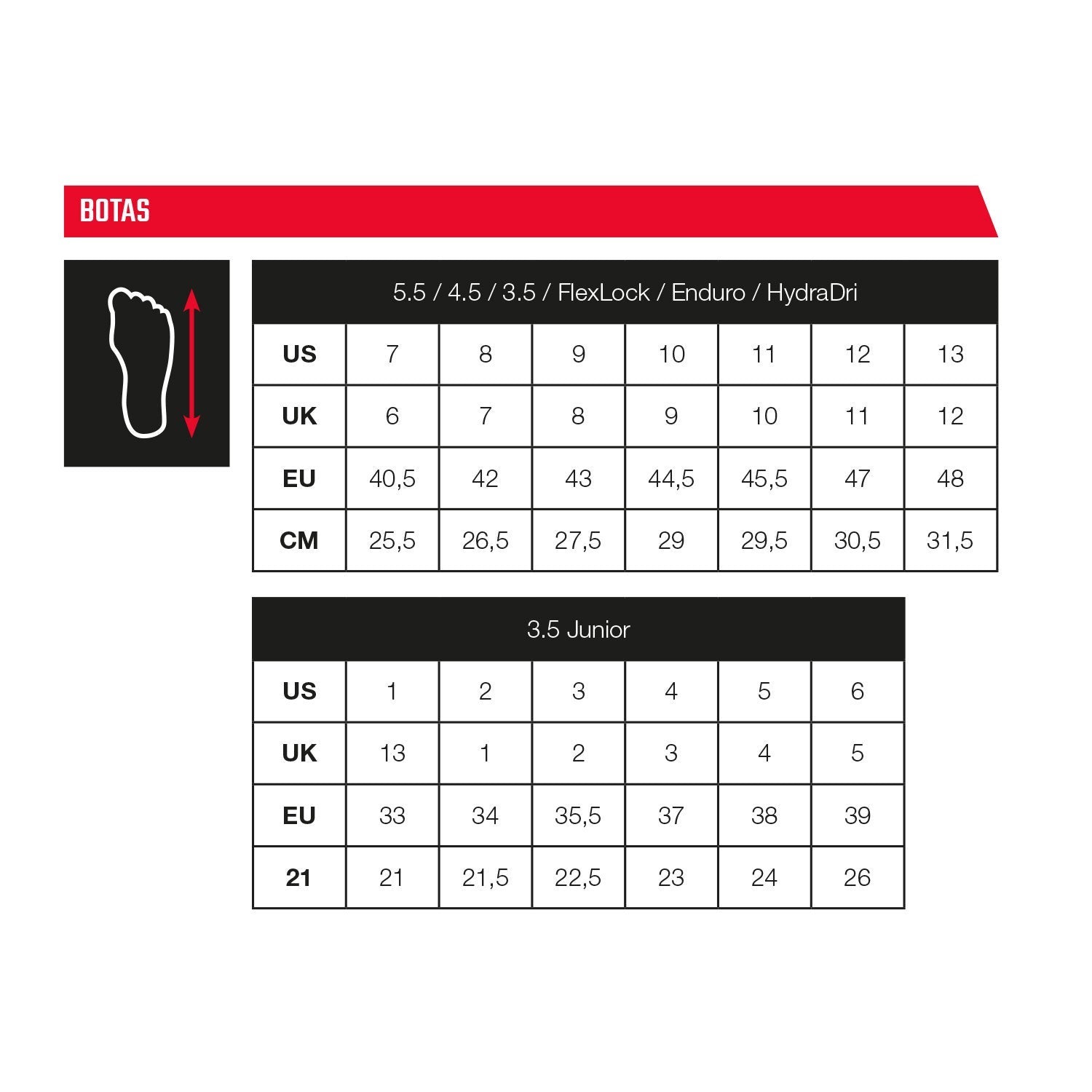 Tallas: US 7–13 / UK 6–12 / EU 40.5–48 / CM 25.5–31